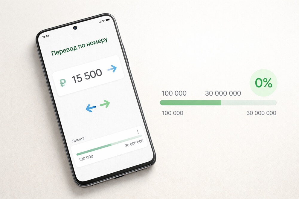 Коротко: другим людям — до 100 000 ₽/мес бесплатно; себе — до 30 млн ₽/мес бесплатно; сверх лимита — 0,5% (до 1 500 ₽).